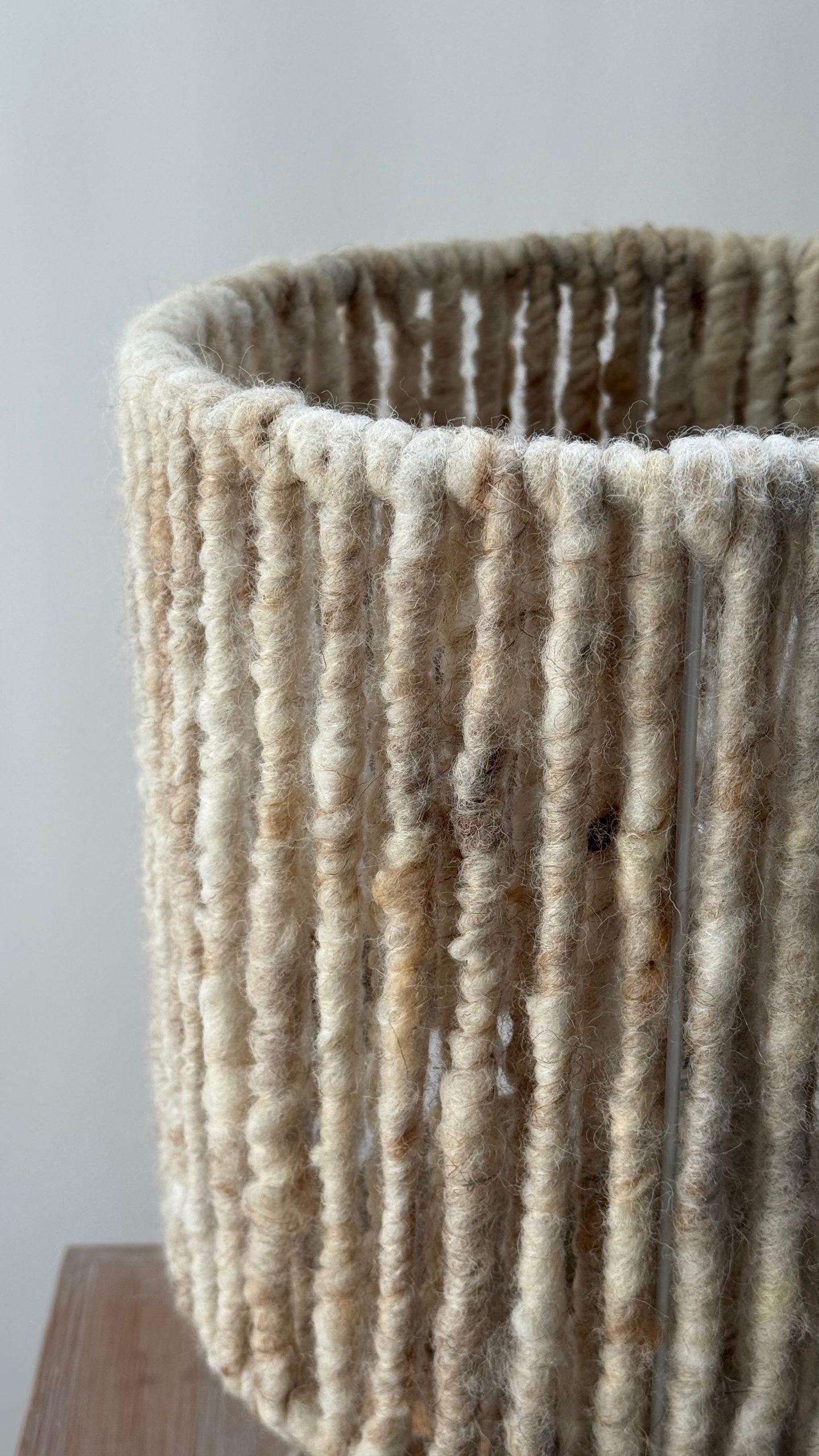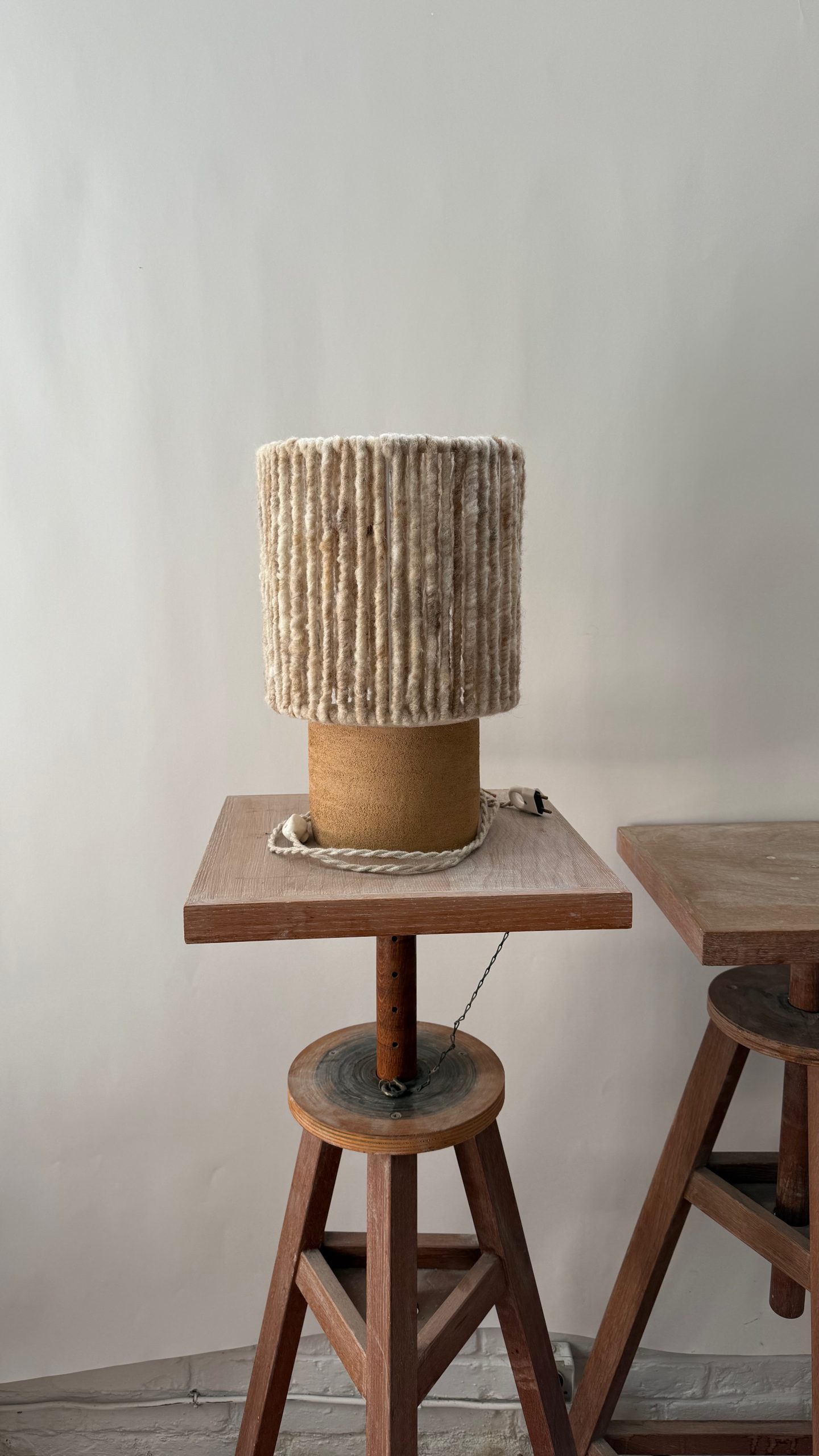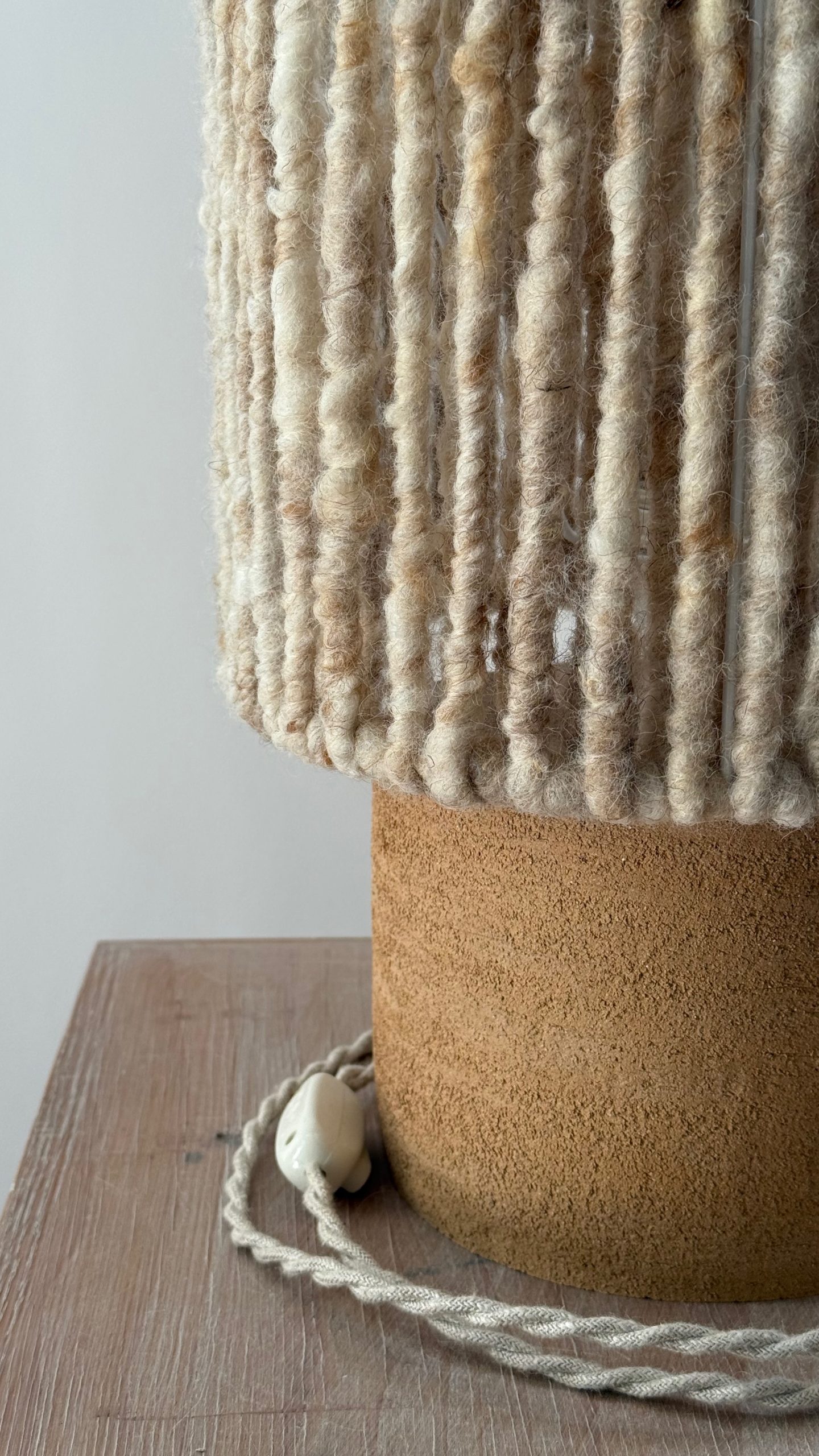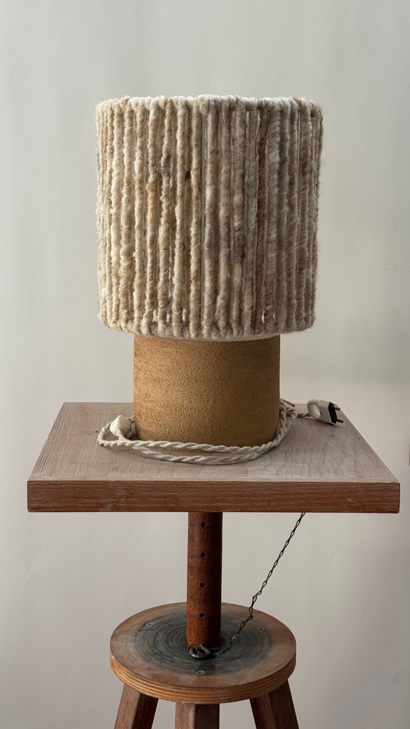 Le pied est ici en grès roux chamotté, et l’abat-jour s’habille pour cette saison, de laine vierge dans un joli camaïeu de beige/ écru chiné, pour un côté bohème chic.