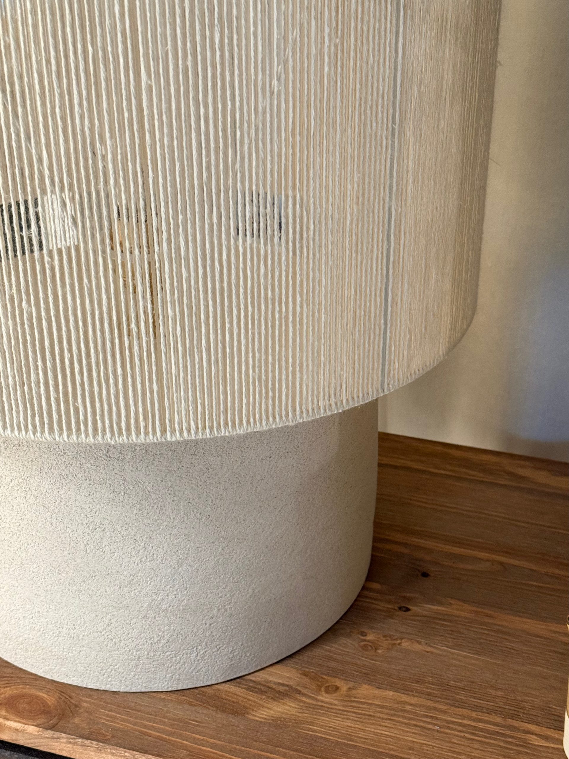 Le pied est réalisé en grès blanc chamotté, son abat-jour en coton recyclé est tissé à la main, il est disponible en 2 couleurs : écru ou jute naturel.