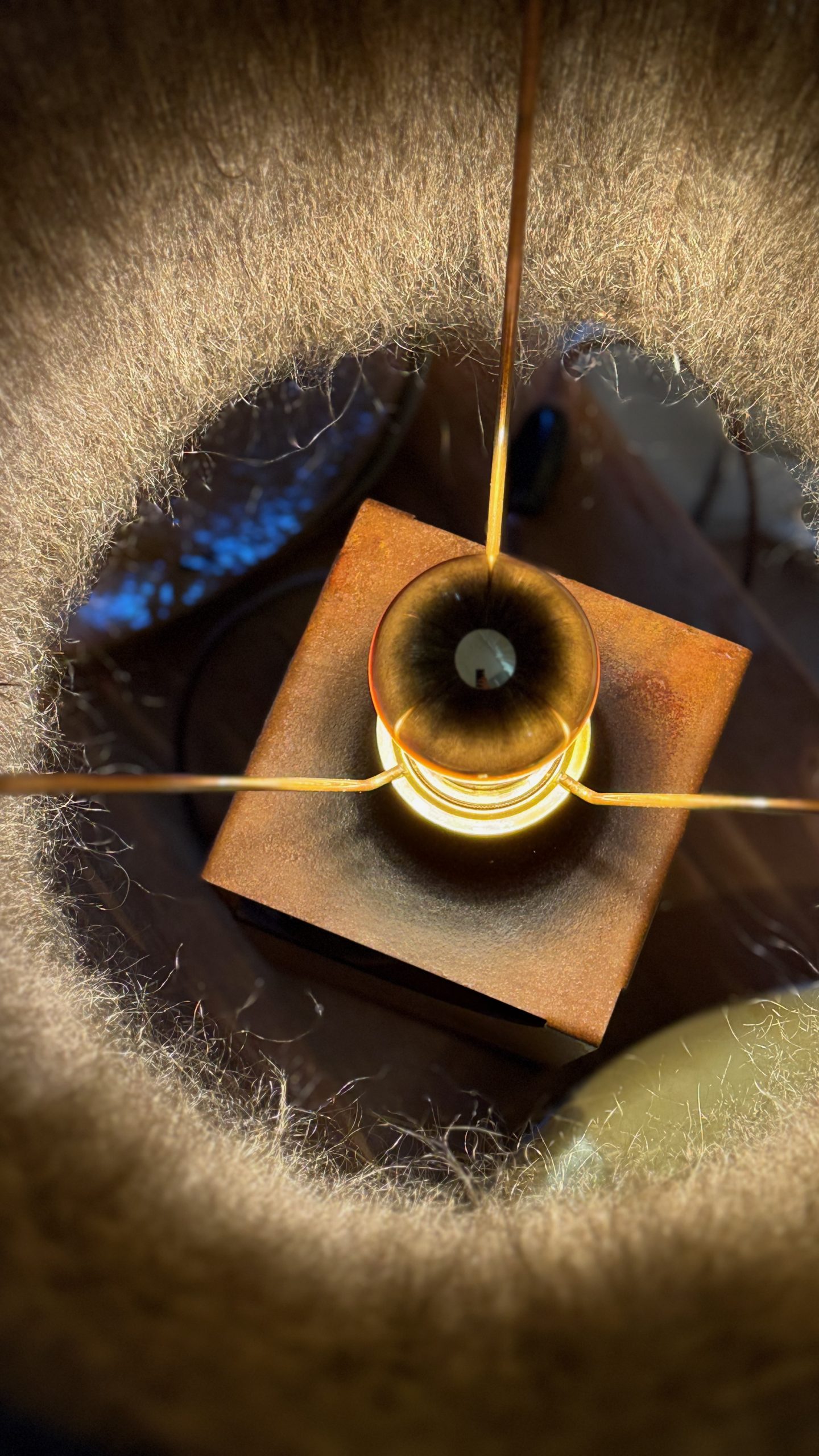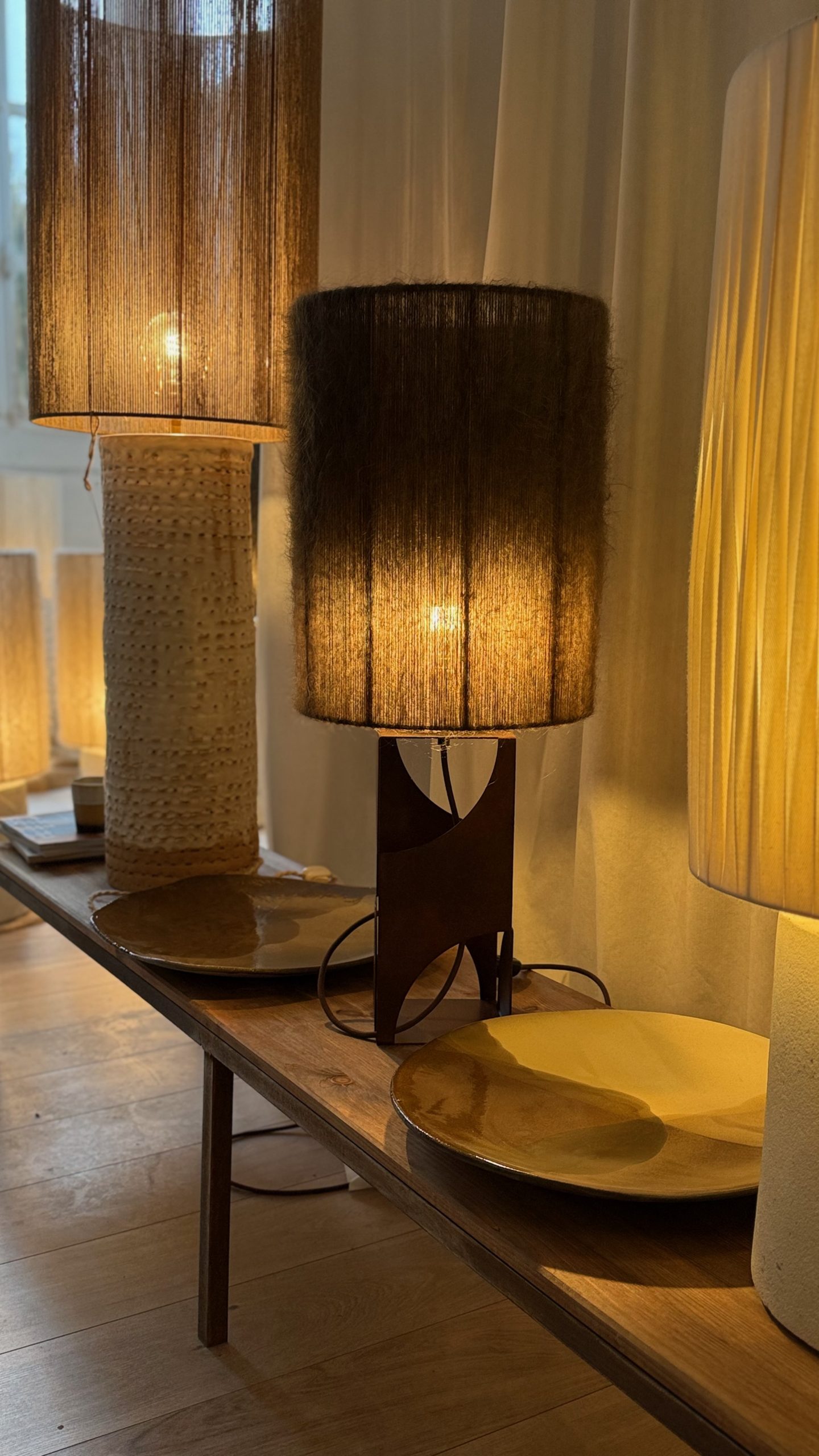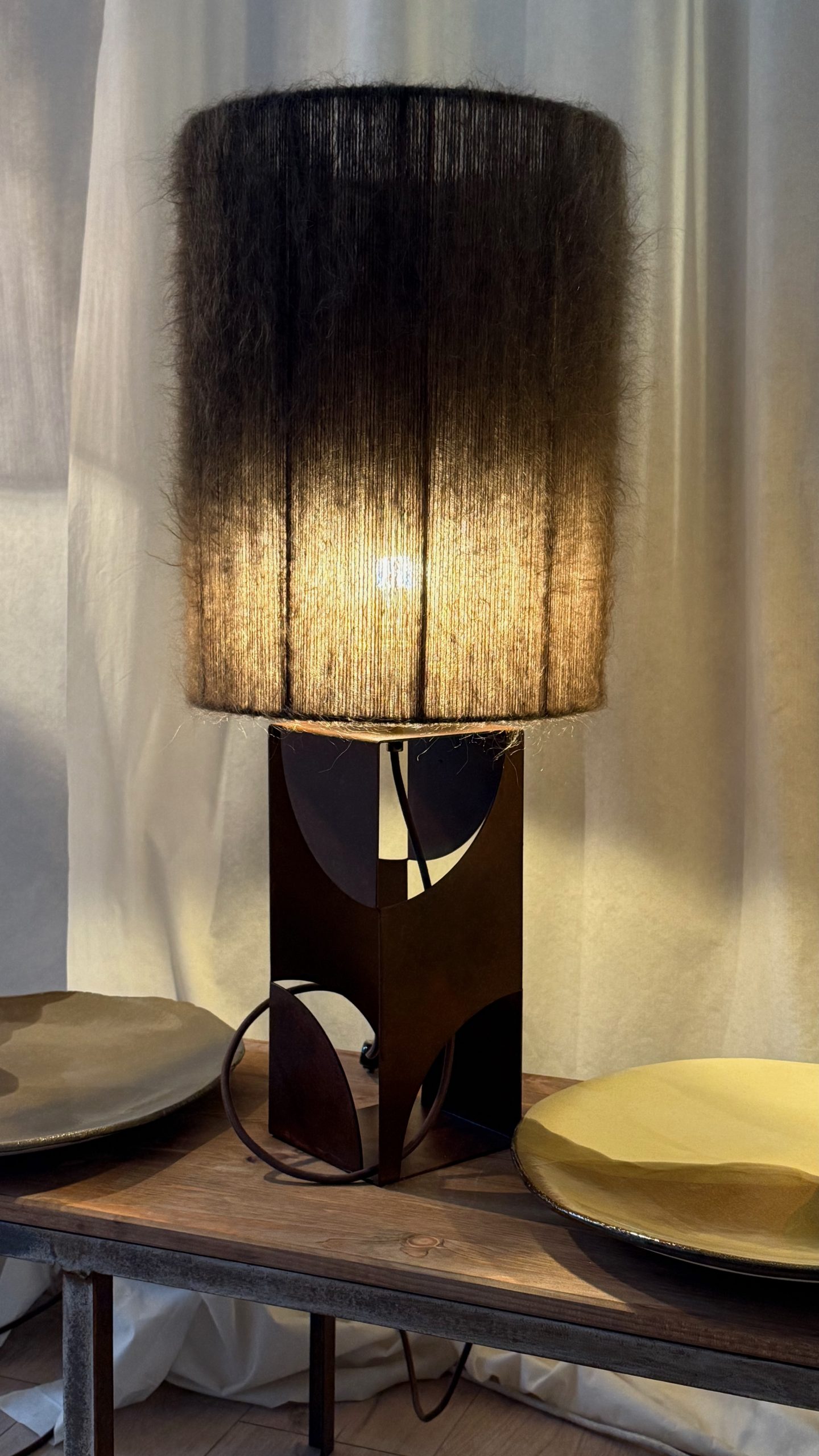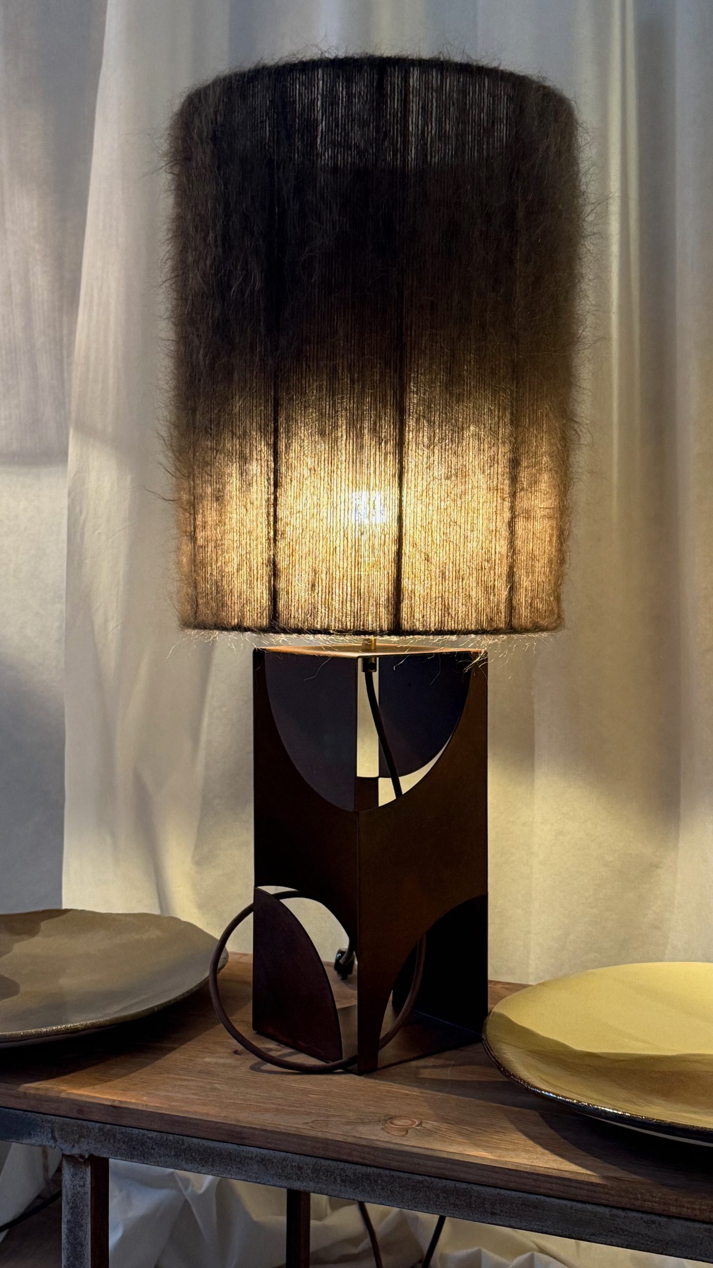 L’abat-jour en laine mohair brun kaki, est tissé à la main dans notre atelier.